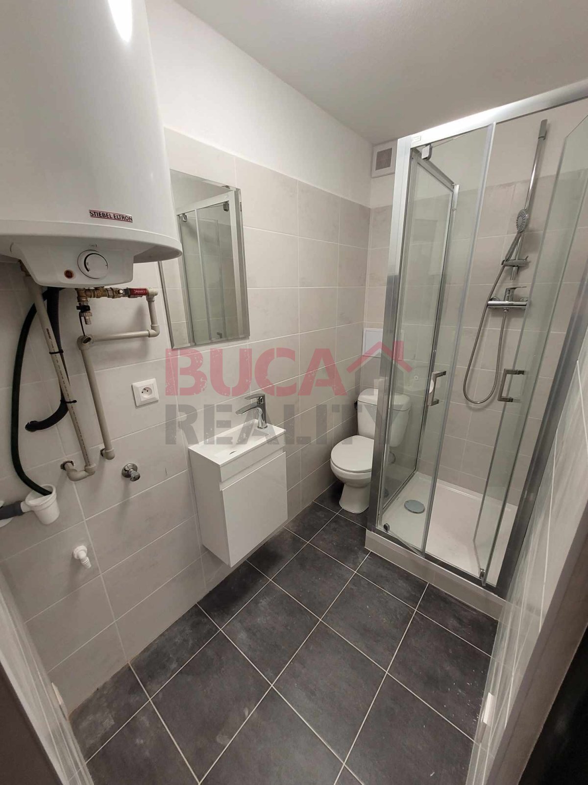 Koupelna je vybavena sprchovým koutem, umyvadlem se skříňkou, WC, elektrickým žebříkem a bojlerem.